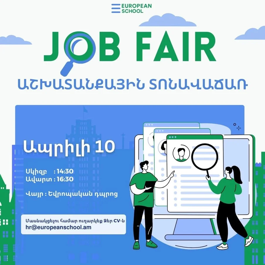 Job fair organized by the school: an opportunity to meet school representatives and admissions committee members in person. The following specialists can apply: art/visual arts, elementary teacher, IB homeroom teacher (English specialist), history, Armenian language and literature, Russian language, English, mathematics (in English), mathematics (in Armenian), physics, chemistry, biology, geography, science (in English, including physics, chemistry, biology), chess, ICT, singing, military training, preschool educator (in Armenian/English), assistant preschool educator, librarian, administrative staff, HR, psychologist, accountant, academic department staff. Send your CV in advance to [email protected], mentioning the title of the relevant position in the subject line.