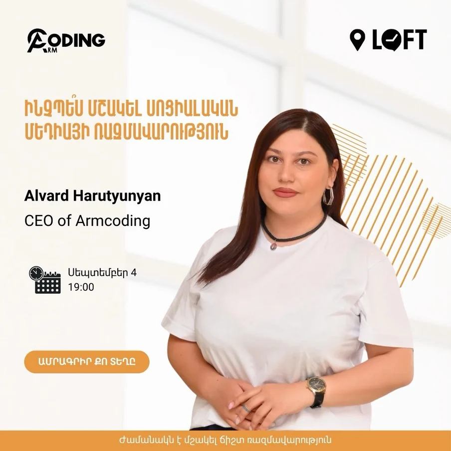 Հրավիրում ենք՝ մասնակցելու «ՍՄՄ ռազմավարություն Բիզնեսի զարգացման համար» թեմայով workshop-ին, որի ընթացքում կսովորեք մշակել Սոցիալական մեդիայի ռազմավարություն, սահմանել սոցիալական մեդիայի հստակ և չափելի նպատակներ, բացահայտել և ուսումնասիրել Ձեր թիրախային լսարանը, ինչպես նաև ճիշտ օգտագործել սոց․ հարթակները՝ Ձեր բիզնեսի արդյունավետ առաջխաղացման համար։