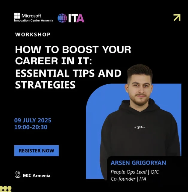 ✅ Գտնել ճիշտ աշխատանքը եւ հարմարեցնել ձեր ռեզյումեն ✅ Անձնական բրենդավորում եւ ուժեղ պրոֆեսիոնալ ցանցի ստեղծում ✅ Փափուկ հմտություններ՝ որոնք իսկապես կարեւոր են աշխատավայրում ✅ Իրական կարիերայի ուղիներ եւ ռազմավարություններ ՏՏ ոլորտում աճելու համար Դա կլինի գրավիչ՝ ինտերակտիվ միջոցառում՝ որը նախատեսված է ինչպես կրտսեր՝ այնպես էլ միջին մակարդակի մասնագետների համար տեխնոլոգիական ոլորտում: