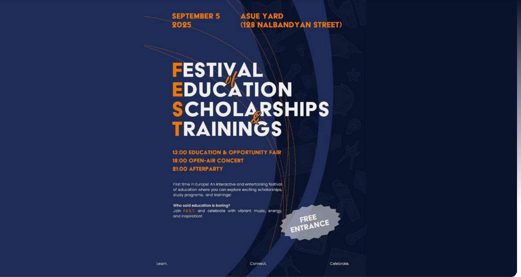 F.E.S.T.–ը ավելի է, քան պարզապես միջոցառում. դա գիտակցության, հնարավորությունների և կապերի գույներով լի միջոցառում է: Հավաքում ենք ուսանողներին, մասնագետներին ու առաջատար կազմակերպություններին՝ մի յուրահատուկ ինտերակտիվ փառատոնի համար Երևանի սրտում: Ինչ է սպասվում քեզ. ✔️ Կրթության և հնարավորությունների ցուցահանդես ✔️ Տեսադաշտային (Outdoor/Open-Air) համերգ ✔️ Afterparty (հետմիջոցառման երեկո): ամփոփում, զրուցարան և զվարճանքներ Միջոցառման կազմակերպիչները. • Copernicus Berlin e.V.՝ բարեգործական կազմակերպություն, որի նպատակն է խթանել միջազգային համագործակցությունը, երիտասարդների հզորացումը և կրթական հնարավորությունները ամբողջ աշխարհում. • Copernicus Yerevan՝ տեղական կենտրոն, որը կապ է ստեղծում միջազգային գործընկերների և հայկական երիտասարդության միջև՝ երաշխավորելով, որ փառատոնը արտացոլի Երևանի ոգին և էներգիան. • ASUE՝ ակադեմիական անկյունադրաձող, որը ներգրավում է ուսանողներին և մասնագետներին, և ստեղծում է կրթության և կարիերայի զարգացման ամուր կապ: