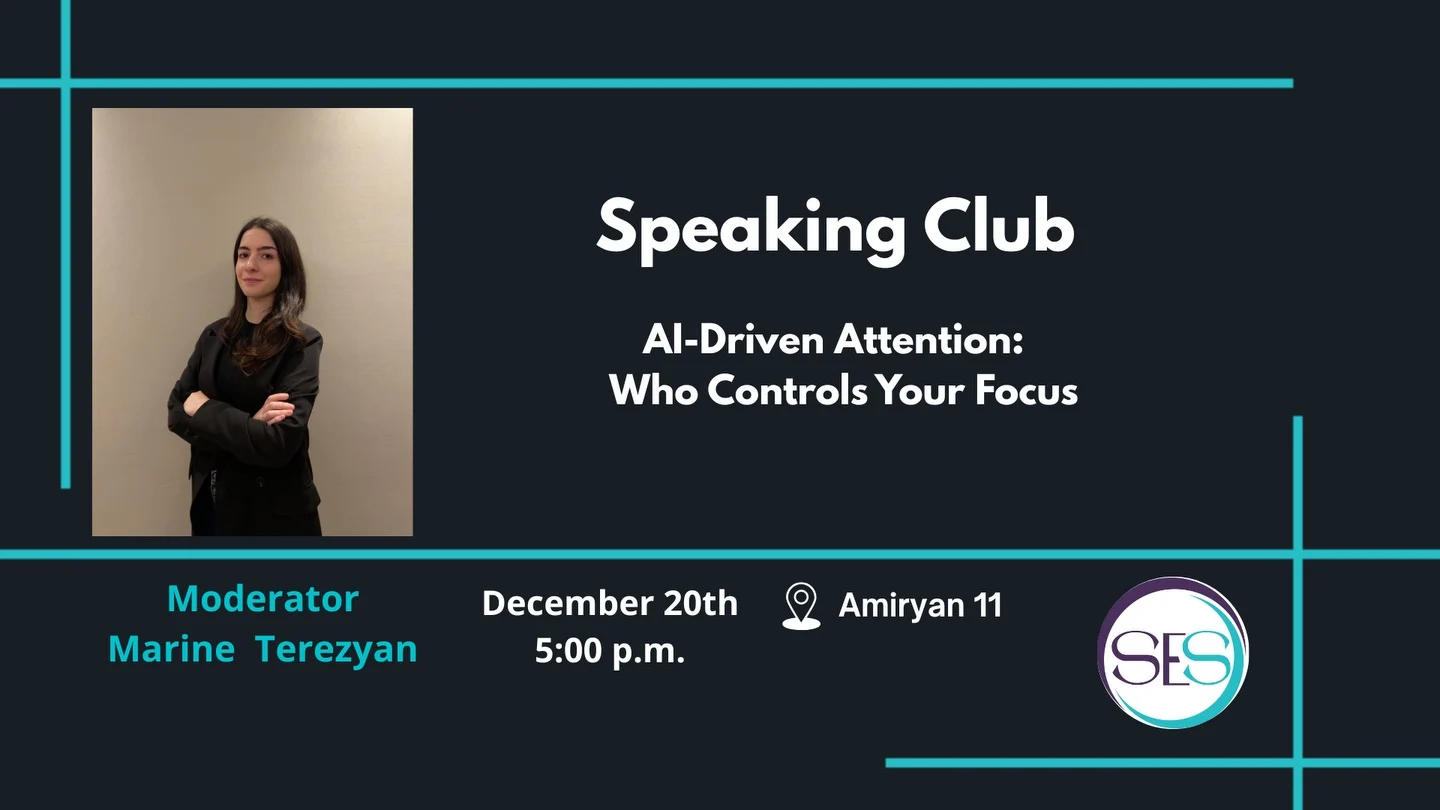 Կարծում եք, որ ինքնե՞րդ եք որոշում, թե ինչին ուշադրություն դարձնել Իսկ եթե ալգորիթմներն արդեն իսկ կառավարո՞ւմ են Ձեզ Մեր հերթական Speaking Club-ին քննարկելու ենք AI-ի ազդեցությունը մեր ուշադրության, վարքագծի և մտքի վրա Մանրամասներն այստեղ․ Oր՝ 20.12.2025 Ժամը՝ 17:00 Վայրը՝ Amiryan 11, 2nd floor Տևողությունը՝ 1.5 ժամ Քննարկման լեզուն՝ անգլերեն Անգլերենի իմացականը սկսած A2 մակարդակից Վճարը՝ 2000 AMD