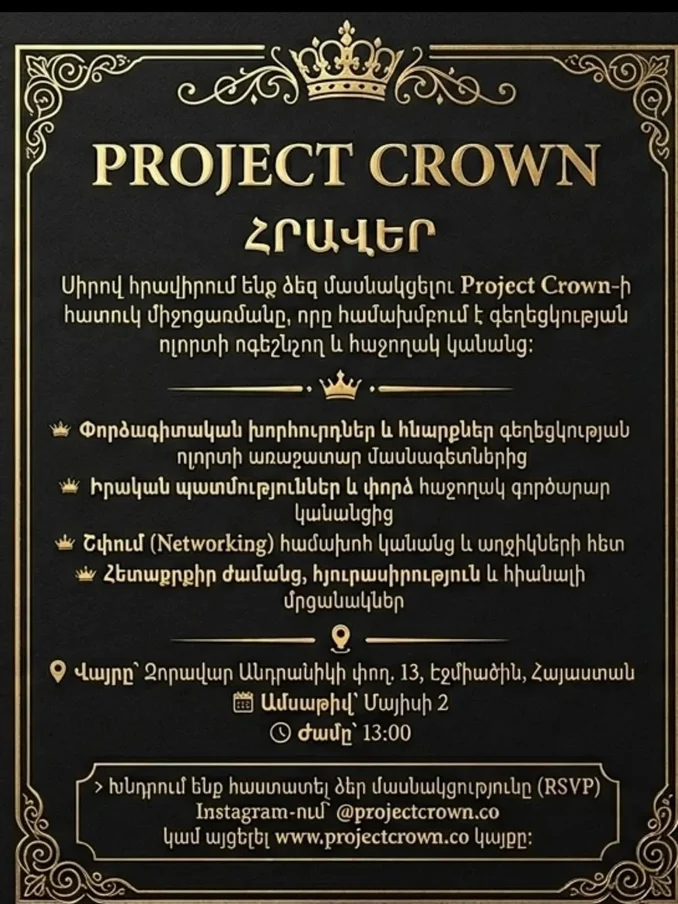 Սիրով հրավիրում ենք Ձեզ մասնակցելու Project Crown-ի հատուկ միջոցառմանը, որը նվիրված է գեղեցկության արդյունաբերության ներշնչող և հաջողակ կանանց։