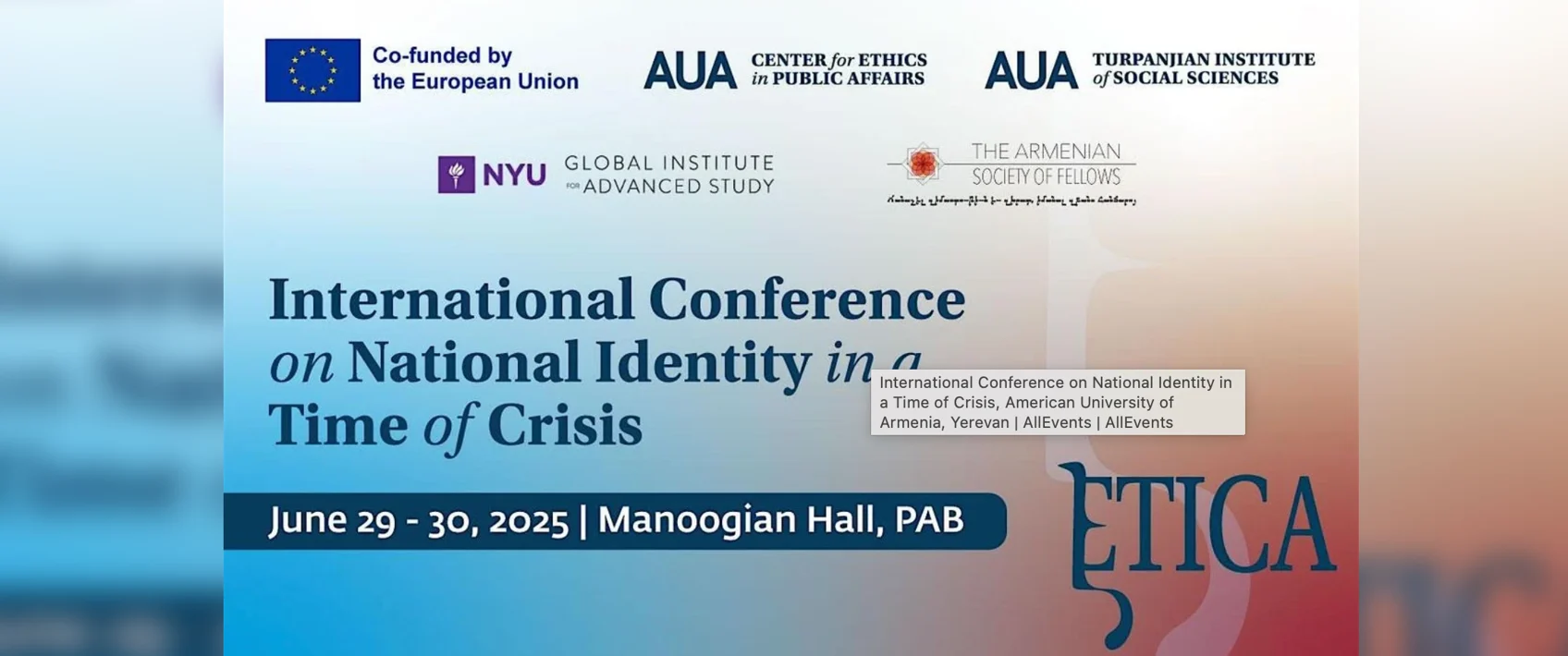 ԱՄՆ Հայկական Համալսարանի (AUA) Հանրային Գործերի Էթիկայի Կենտրոնը, համագործակցությամբ Նյու Յորքի Համալսարանի Գլոբալ Հիմնադրամի, Հայկական Ֆելոների Ընդհանուր Հասարակության և AUA Թուրքպանճյան Սոցիալական Գիտությունների Ինստիտուտի հետ, ուրախ է տեղեկացնել միջազգային կոնֆերանսի մասին, որը տեղի կունենա հունիսի 29-30-ը։ Այս կոնֆերանսը կքննարկի հիմնարար հարցեր՝ կապված ազգային ինքնության տեղը, կարևորությունը և բնույթը հետ՝ համաշխարհային բազմազան և շարունակվող մարտահրավերների և անորոշությունների պայմաններում։ Մասնավորապես՝ հատուկ հրավիրված պանելը կանդրադառնա պատմական հուշարձանների և մշակութային ինքնության դերին ճգնաժամային ժամանակներում՝ ընդգրկելով ճանաչված միջազգային գիտնականների և փորձագետների։ Գլխավոր բանախոսներ՝ Հունիսի 29, 14:00-18:00